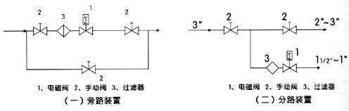 1、安裝時(shí)電磁閥線圈向上,并保持垂直位置,電磁閥上箭頭或標(biāo)記應(yīng)與管道流向一致,不得安裝在有濺水或漏水的地方。 2、電磁閥的工作介質(zhì)應(yīng)清潔無(wú)顆粒雜質(zhì),電磁閥內(nèi)件表面上的污物及過(guò)濾器,需定期清潔干凈。 3、在電磁閥發(fā)生故障時(shí),為了及時(shí)隔離電磁閥,并保證系統(tǒng)正常運(yùn)行,最好安裝旁路裝置(如圖一)。 4、在管路系統(tǒng)中,安裝在支路上的電磁閥通徑應(yīng)小于主管道閥門的通徑(如圖二)。 5、安裝在電磁閥前,管道必須清洗干凈。建議在閥前安裝過(guò)濾器,蒸汽管道安裝疏水閥。 6、不能將閥安裝在管道的低凹處,以免因蒸汽冷凝水、雜質(zhì)等沉淀在閥內(nèi)而妨礙動(dòng)作。 7、普通型不能在爆炸危險(xiǎn)場(chǎng)合使用。 8、在管路剛性不足情況下,建議把閥前管道用支架固定,以免電磁閥工作時(shí)引起振動(dòng)。 9、在安裝前,要注意要看清產(chǎn)品標(biāo)牌,認(rèn)真閱讀使用說(shuō)明書,判斷產(chǎn)品是否符合使用條件。 10、電磁閥前后管道上需安裝壓力表,以便觀察管道壓力。