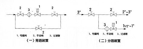 煤氣電磁閥--安裝須知 1、安裝時(shí)電磁閥線圈向上,并保持垂直位置,電磁閥上箭頭或標(biāo)記應(yīng)與管道流向一致,不得安裝在有濺水或漏水的地方。 2、電磁閥的工作介質(zhì)應(yīng)清潔無(wú)顆粒雜質(zhì),電磁閥內(nèi)件表面上的污物及過濾器,需定期清潔干凈。 3、在電磁閥發(fā)生故障時(shí),為了及時(shí)隔離電磁閥,并保證系統(tǒng)正常運(yùn)行,最好安裝旁路裝置(如圖一)。 4、在管路系統(tǒng)中,安裝在支路上的電磁閥通徑應(yīng)小于主管道閥門的通徑(如圖二)。 5、安裝電磁閥前,管道必須清洗干凈。建議在閥前安裝過濾器,蒸汽管道安裝疏水閥。 6、不能將閥安裝在管道的低凹處,以免因蒸汽冷凝水、雜質(zhì)等沉淀在閥內(nèi)而防礙動(dòng)作。 7、普通型不能在爆炸危險(xiǎn)場(chǎng)合使用。 8、在管路剛性不足情況下,建議把閥前管道用支架固定,以免電磁閥工作時(shí)引起振動(dòng)。 9、在安裝前,要注意看清產(chǎn)品標(biāo)牌,認(rèn)真閱讀使用說明書,判斷產(chǎn)品是否符合使用條件。 10、電磁閥前后管道上需安裝壓力表,以便觀察管道壓力。