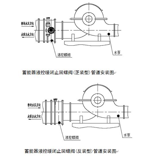 本電控設(shè)備接入DC24V備用電源。當(dāng)常規(guī)電源失電時,備用電源自動接入,保證閥門自動工作。當(dāng)水泵停機(jī)時,蝶閥才同時關(guān)閥。 6.2.5遠(yuǎn)程監(jiān)控 控制系統(tǒng)可接收遠(yuǎn)程開閥、關(guān)閥、停閥、水泵狀態(tài)信呈外,還輸出各種信號供遠(yuǎn)程DCS監(jiān)控,主要有:閥門位置信號、遠(yuǎn)程狀態(tài)信號、油泵狀態(tài)信號、電機(jī)過載、開閥超時信號、閥門位置模擬信號等,信號均為無源干接點開關(guān)量信號。 6.3手動操作 動力電源失電時,搖動手搖泵,亦可實現(xiàn)閥門開啟。 手動關(guān)閉時打開“10常閉截止閥”,關(guān)閥到位后,關(guān)閉“10常閉截止閥”;要放掉蓄能器的壓力油時,打開“09常閉截止閥”,壓力油放完后關(guān)閉;“08常開截止閥”通常狀態(tài)是打開的,如果“06電磁球閥”有故障,需要檢修,關(guān)閉“08常開截止閥”,進(jìn)行檢修,不影響閥門使用(可以液壓或手動開閥,手動關(guān)閥)。 手動功能主要是利用備用電源進(jìn)行閥門調(diào)試,或在特殊情況下的閥門緊急關(guān)閉。 1.5壓力變送器高、低壓調(diào)整 壓力變送器高、低壓的調(diào)整方法:點擊主菜單“控制面板”,點擊子菜單“油壓設(shè)定”,再點擊子菜單“上限”“下限”,彈出數(shù)字框,自行設(shè)定就行了。出廠時已設(shè)定,不要隨意更改。 七、吊裝及調(diào)試維護(hù) 7.1吊運 運輸起吊時不得翻轉(zhuǎn)、倒放,開箱后用吊車運蝶閥,起吊時注意在四個起吊點中選取平衡位置。 7.2儲存 產(chǎn)品長時間存放時,放于干燥處,閉進(jìn)出口兩端,在密封面上涂防銹油。臨時停放時可在外墻板位置增加輔助支承以保持平穩(wěn)。半年不安裝,液壓系統(tǒng)須清洗換油。 7.3安裝 安裝前應(yīng)核對本閥銘牌參數(shù)是否符合使用要求,清洗閥體通道及蝶板、檢查各部位有無有無損壞現(xiàn)象,各零件聯(lián)接螺栓是否緊固。 正反安裝分別按圖所示,確認(rèn)液壓傳動系統(tǒng)與水泵出水管道的相對方位,將閥門安裝在水泵出口。 蝶板安裝的基礎(chǔ)上應(yīng)校正水平,保證閥軸不傾斜。閥門支腳及輔助支承主要用于保證閥門安裝運行平穩(wěn),不宜大量承受與其垂直的管道軸向推力;軸向水推力應(yīng)通過閥前或閥后管道傳遞到支承基礎(chǔ)上。 注:液控止回蝶閥閥體上的方向表示閥門的承壓方向,當(dāng)安裝于水泵出口時,閥體上箭頭方向應(yīng)與水泵出水方向相反,且閥門立、臥安裝不影響效果。