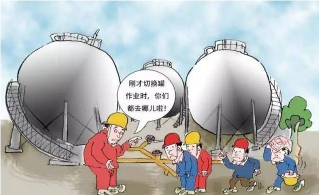 本條主要規(guī)定了儲罐區(qū)手動切水、切罐、裝卸車作業(yè)管理要求。 手動切水是指通過間斷手動打開切水閥放出沉積在油氣儲罐底部的水 切罐是指將進(jìn)出物料從一個儲罐切換到另一個儲罐 裝卸車是指將儲罐中物料裝車或從運輸車輛向儲罐中輸送物料。 切水、切罐、裝卸車等作業(yè)環(huán)節(jié)應(yīng)當(dāng)嚴(yán)格遵守安全作業(yè)標(biāo)準(zhǔn)、規(guī)程和制度,并在監(jiān)護(hù)人員現(xiàn)場指揮和全程監(jiān)護(hù)下進(jìn)行。若監(jiān)護(hù)不到位,極易造成油氣泄漏,引發(fā)事故。 3.嚴(yán)禁關(guān)閉在用油氣儲罐安全閥切斷閥和在泄壓排放系統(tǒng)加盲板