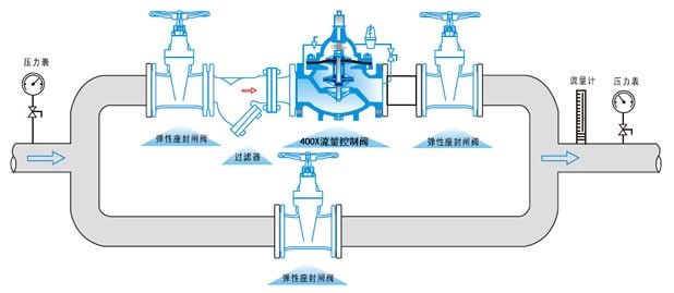400X流量控制閥由主閥、流量調(diào)節(jié)閥、針閥、導(dǎo)閥、球閥、微形過(guò)濾器和壓力表組成水力控制接管系統(tǒng)。利用水力自動(dòng)操作,控制和調(diào)節(jié)主閥開度,使通過(guò)主閥的流量保持不變。本產(chǎn)品利用水力自力控制,不需要其它裝置和能源,保養(yǎng)簡(jiǎn)便,流量控制穩(wěn)定。廣泛用于高層建筑、生活區(qū)等供水管網(wǎng)系統(tǒng)及城市供水工程。