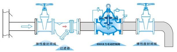 600X水力電動控制閥由主閥、電磁導閥、針閥、球閥、微形過濾器和壓力表組成水力控制接管系統(tǒng)。通過電磁導閥可以實現(xiàn)對閥門開啟和關閉的遙控。加裝附加裝置后,可控制開啟和關閉的速度。本產品利用導閥控制閥門的開啟和關閉,節(jié)省能源。可代替其它閥門大型電動裝置。 二、600X水力電動控制閥--工作原理