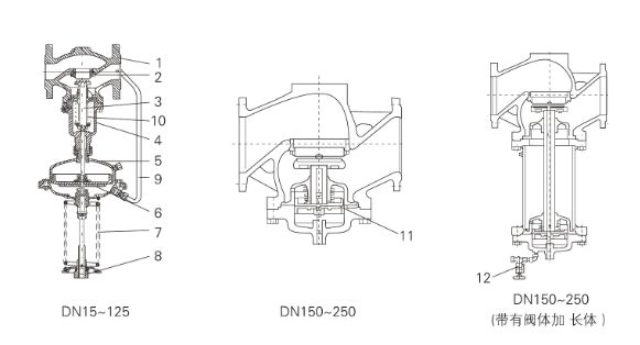 | 閥體 | 閥座 | 閥軸 | 閥蓋 | 膜蓋 | 膜片 | 彈簧 | 調(diào)節(jié)螺母 | 導(dǎo)壓管 | 波紋管 | 平衡膜片 | 充注閥 |